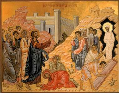Movida por la gratitud, María te trae un frasco de mirra como una deuda para con su hermano (Jn 12,3) y te canta por todos los siglos. Como mortal, tú invocas al Padre; como Dios despiertas a Lázaro. Por esto te cantamos, oh Cristo, por los siglos de los siglos… Tú resucitas a Lázaro, un muerto de cuatro días. Tú lo haces surgir de la tumba, convirtiéndole en testimonio verídico de tu resurrección al tercer día. Tú caminas, lloras, hablas, Salvador mío, mostrando tu naturaleza humana. Pero resucitando a Lázaro revelas tu naturaleza divina. De manera inefable, Señor, Salvador mío, según tus dos naturalezas, has realizado mi salvación.